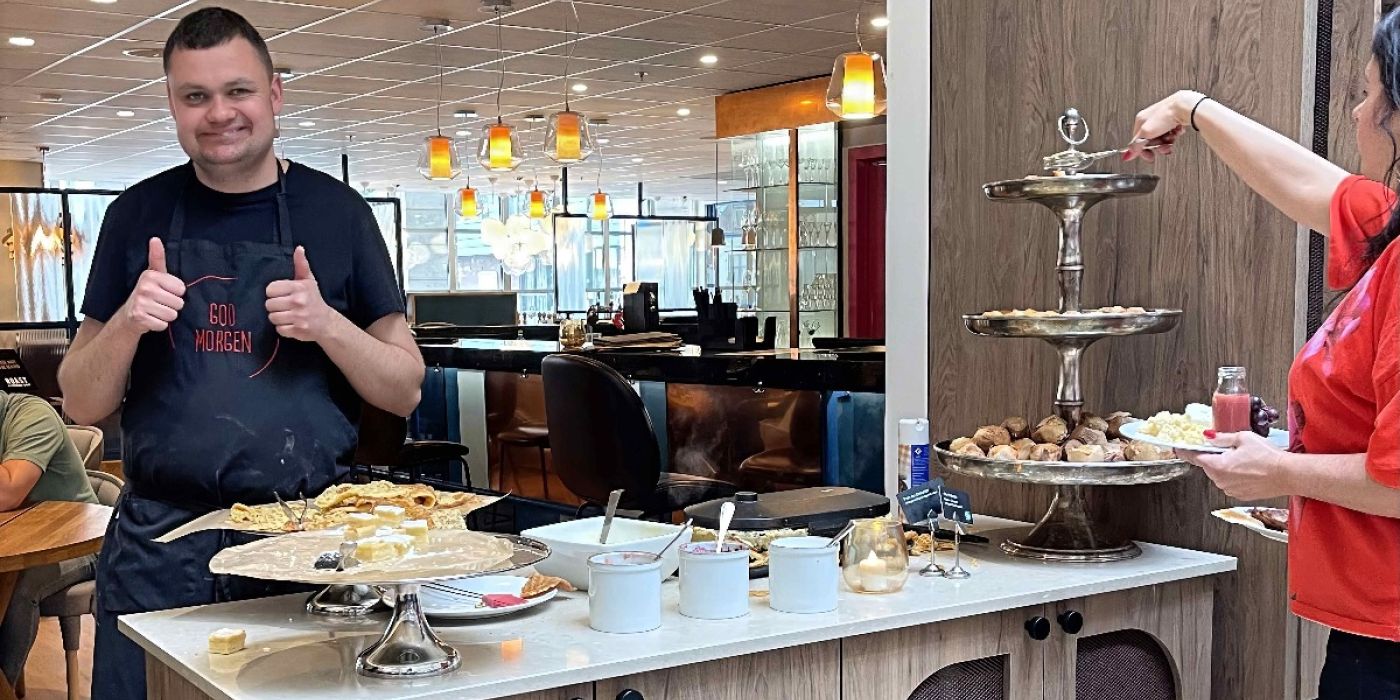 Tore synes ikke arbeidsoppgavene har vært vanskelige. Den aller viktigste oppgaven handler nemlig om å gi gjestene en god start på dagen med en hyggelig frokostopplevelse: «God morgen! Har du lyst på en vaffel? Og du, som er like pen som en blomst, ønsker kanskje påfyll med kaffe?» smiler Tore, som allerede er blitt populær blant gjestene.