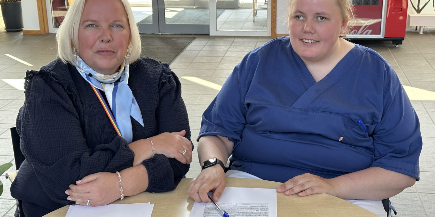 Helena (29) har signert sin første arbeidskontrakt, og er nå fast ansatt som servicevert ved Bispegra omsorgssenter i Kristiansand kommune.