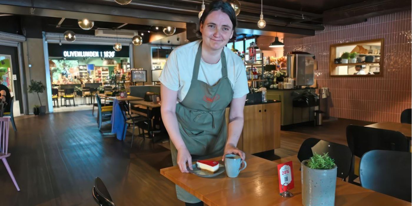 Marit har varierte arbeidsoppgaver, hvor hun blant annet rydder bord, vasker opp, baker og lager sommerlimonade.